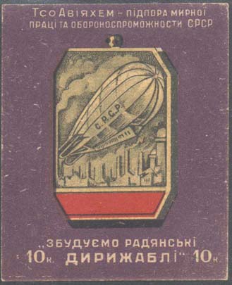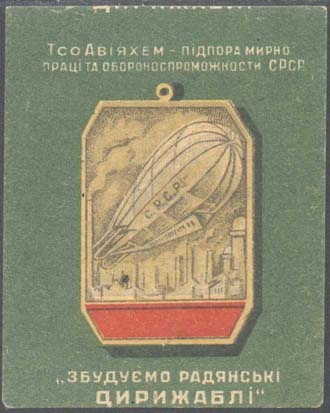 1931 1931 г. Разм. 55 х 68 мм. Многоцветная печать на толстой желтоватой бумаге. В центре жетон с изображением дирижабля «СССР» над заводскими зданиями. Вверху текст на украинском языке в две строки: «Осоавиахим - опора мирного труда и обороноспособности СССР». Внизу текст на украинском языке в две строки: «Построим советские дирижабли».
