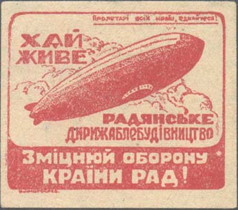 1931 1931 г. 17.02.1931 г. Разм. рамки 53 х 43 мм. Одноцветная печать на желтой бумаге. В рамке дирижабль, летящий вправо. В центре текст на украинском языке в четыре строки: «Да здравствует советское дирижаблестроение». Справа сверху текст с подчеркиванием на украинском языке: «Пролетарии всех стран соединяйтесь!». Внизу текст на украинском языке в две строки: «Крепи оборону страны».