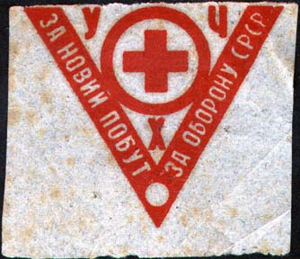 1930 1930 г. 02.-22.12.1930 г. Разм. 50 х 56 мм. Одноцветная печать на сероватой бумаге. В центре в круглой рамке диаметром 20 мм красный крест. Внизу на ленте в виде латинской буквы «V» текст на украинском языке: «За новую жизнь. За оборону СССР». Вокруг рамки буквы аббревиатуры «УКК» на украинском языке.