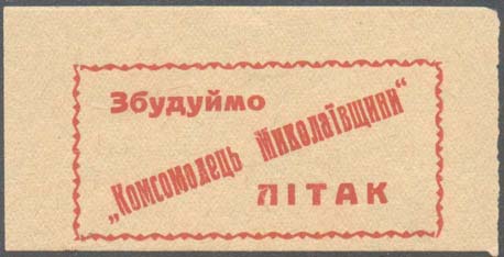1926 1926(?) г. Разм. рамки 57 х 27 мм. Одноцветная печать на желтоватой бумаге. В прямоугольной рамке текст в три строки на украинском языке: «Построим самолет «Комсомолец Николаевщины»».