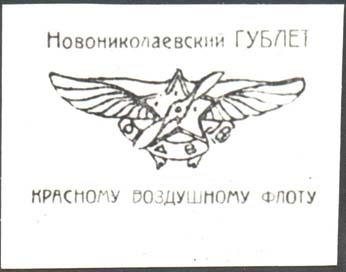 1924 1924(?) г. Разм. 59 х 46 мм. Одноцветная печать на белой бумаге. В центре значок ОДВФ СССР. Текст в две строки: «Новониколаевский ГУБЛЕТ красному воздушному флоту».