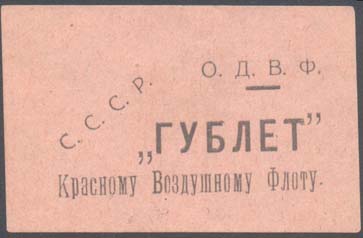 0(?) 0(?) г. Разм. 60 х 38 мм. Одноцветная печать на розово-серой бумаге. В центре текст в две строки: ««ГУБЛЕТ» Красному Воздушному флоту». В правом верхнем углу аббревиатура «О.Д.В.Ф.». В левом верхнем углу наклонно аббревиатура «С.С.С.Р.».