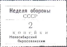 1931 1931 г. Разм. ≈ 52 х 45 мм. Одноцветная печать на бумаге различных цветов. Зубц. 11 1/2. В центре номинал. Сверху между двумя горизонтальными пунктирными линиями текст в две строки: «Неделя обороны СССР». Внизу текст в две строки: «Новосибирский Окросоавиахим».