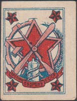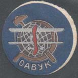 1924 1924(?) г. Круг диаметром 24 мм. Многоцветная печать на белой бумаге. На фоне серпа и молота земной шар и самолет-биплан (вид спереди). Внизу аббревиатура «ОАВУК».