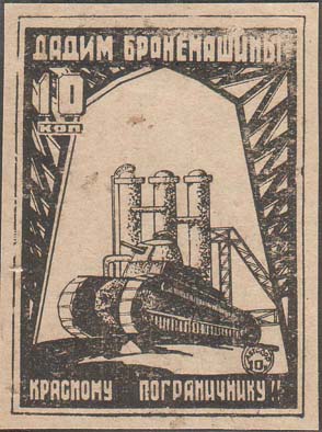 1932 1932 г. Разм. рамки 45 х 61 мм. Одноцветная печать на бумаге различных цветов. В прямоугольной рамке арка из металлических конструкций. Под аркой танк на фоне заводских сооружений. В левом верхнем углу номинал. Сверху текст: «Дадим бронемашины». Внизу продолжение текста: «Красному пограничнику!». В правом нижнем углу в двойной круглой рамке номинал и аббревиатура «Автодор».
