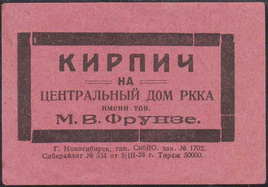 1926 1926 г. 05.03.1926 г. Разм. рамки 72 х 36 мм. Одноцветная двухсторонняя печать на розовой бумаге. На лицевой стороне в толстой прямоугольной рамке в центре текст в пять строк: «Кирпич на Цен-тральный дом РККА им. тов. М.В.Фрунзе». Внизу мелким шрифтом выходные данные: «Г. Новосибирск, тип. СибВО. Зак. №1702 Сибкрайлит. №534 от 5/III-26 г. Тираж 50000». На обороте номинал: «50 коп.».