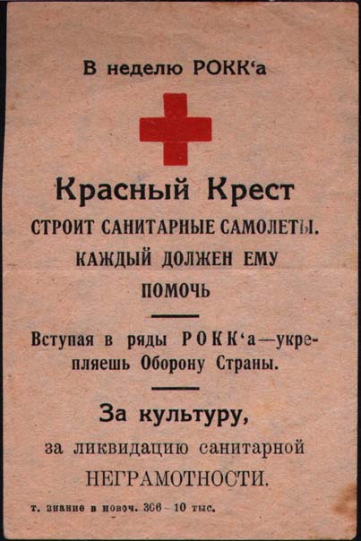 1930 1930(?) г. Разм. 68 х 102 мм. Двухцветная печать на бумаге различных цветов. Сверху текст: «В неделю РОККа». Ниже красный крест и текст в четыре строки: «Красный Крест строит санитарные самолеты. Каждый должен ему помочь». Ниже текст в две строки: «Вступая в ряды РОККа – укрепляешь Оборону Страны». Ниже текст в три строки: «За культуру, за ликвидацию санитарной неграмотности». Внизу справа мелким шрифтом выходные данные: «Т. Знание в Новоч. 306 – 10 тыс.».