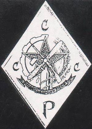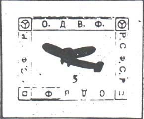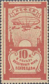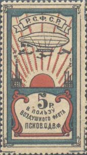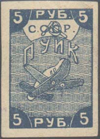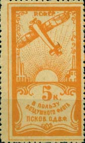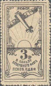 1923 1923 г. Разм. рамки 28 х 40 мм. Одноцветная печать на желтоватой бумаге. В центре самолет, летящий вправо вверх. Сверху в рамке сложной формы серп и молот и аббревиатура «С.С.С.Р.». Под щитом полукругом аббревиатура «ПУИК». По внутренним углам номинал.