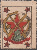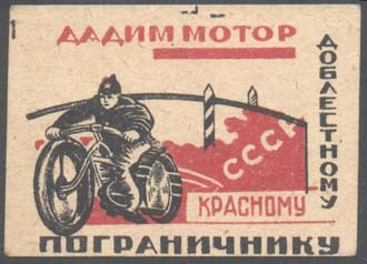 1932 1932(?) г. Разм. 53 х 38 мм. Двухцветная печать на плотной кремовой бумаге. В центре красноармеец на мотоцикле на фоне стилизованного изображения карты СССР и пограничных столбов. Сверху текст: «Дадим мотор». Справа вертикально продолжение текста: «Доблестному». Справа внизу продолжение текста в две строки: «Красному пограничнику».
