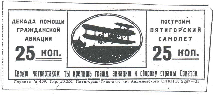 1931 1931 г. Листок из квитанционной книжки разм. рамки 134 х 49 мм. Одноцветная печать на желтоватой бумаге. Левосторонняя нерегулярная зубц. В прямоугольной рамке в центре дополнительная двойная овальная рамка в которой самолет-биплан, летящий над городом. Слева текст в три строки: «Декада помощи гражданской авиации». Ниже номинал. Справа текст в три строки: «Построим пятигорский самолет». Ниже номинал. Внизу текст: «Своим четвертаком ты крепишь гражд[анскую]. авиацию и оборону Страны Советов». Под рамкой выходные данные: «Горлито N 409. Тир. 20.000. Пятигорск. Типо-лит. им. Анджиевского СККПО. 2287-31».