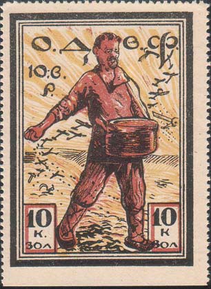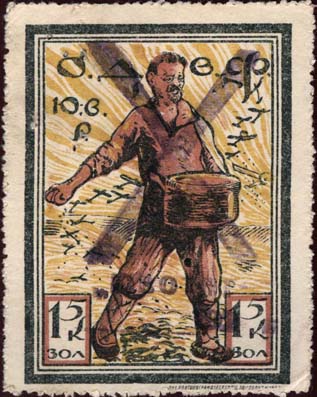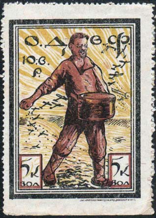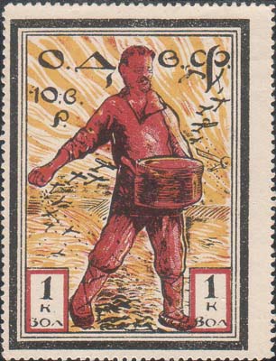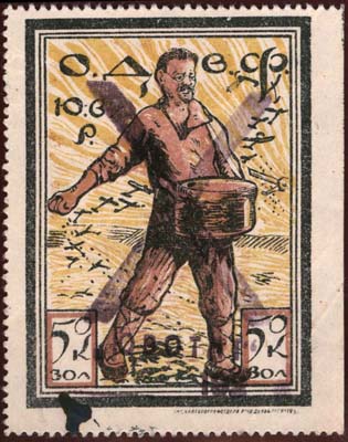 1924 1924 г. Первый областной выпуск. Разм. рамки 45 х 61 мм. Трехцветная печать на белой бумаге. Зубц.11 1/2. В прямоугольной рамке в центре крестьянин с лукошком, рассеивающий зерна, из которых возникают самолеты. Сверху аббревиатура в три строки: «О.Д.В.Ф. Ю.В.Р.». Цифры номинала прямые. Под рамкой выходные данные: «Лит. Кавтопографотдела, Р.н/Д. Доноблит N703». Слева внизу над номиналом серп и молот.