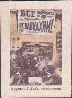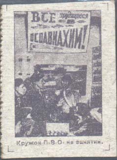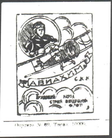 1926 1926(?) г. Разм. рамки 42 х 60 мм. Одноцветная печать на желтой бумаге. В прямоугольной рамке в центре самолет-биплан, летящий вправо. Сверху слева в двойной круглой рамке летчик за штурвалом самолета. Ниже на ленте текст: «АВИАХИМ С.К.К.». Ниже на фоне облаков текст в три строки: «Трудовой народ строй воздушный флот». Внизу под рамкой мелким шрифтом выходные данные: «Окрлит №69, Тираж 10000».