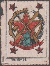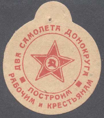 1927 1927(?) г. Виньетка сложной формы в виде круга диаметром 38 мм с ушком сверху. Одноцветная печать на желтоватой бумаге. В центре пятиконечная звезда с серпом и молотом. По окружности текст: «Построим два самолета Донокруга рабочим и крестьянам».