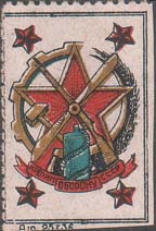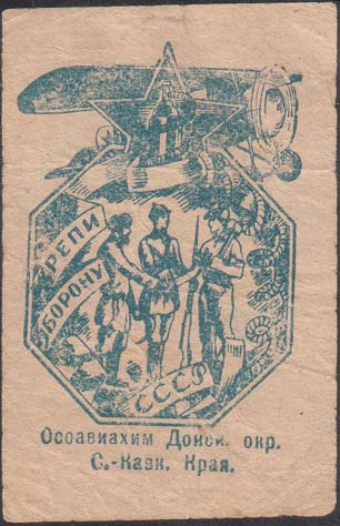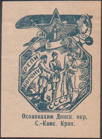 1930 1930(?) г. Разм. 53 х 71 мм. Одноцветная печать на кремовой бумаге. В центре в восьмиугольной рамке рабочий, крестьянин и красноармеец пожимают друг другу руки. Сверху самолет, пятиконечная звезда, баллон с газом и лента. На ленте текст: «Крепи оборону СССР». Внизу текст в три строки: «Осоавиахим Донск[ого]. Окр[уга]. С[еверо].-Кавк[азского]. Края».