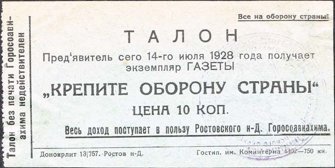 1928 1928 г. Листок из квитанционной книжки разм. 120 х 60 мм. Одноцветная печать на зеленовато-серой бу-маге. Левосторонняя зубц. 11 1/2. В центре текст шесть строк: «ТАЛОН Предъявитель сего 14-го июля 1928 г. получает экземпляр газеты «Крепите оборону страны». Цена 10 к. Весь доход поступает в пользу Ростовского Н_Д Осоавиахима». Сверху справа текст мелким шрифтом в одну строку: «Все на оборону страны!». Внизу под чертой мелким шрифтом выходные данные: «Донокрлит 13/757. Ростов Н-Д. Гостип. Им. Коминтерна 4302 – 750. Слева снизу вверх текст в две строки: «Талон без печати Горосоавиахима недействителен». На лицевой стороне фиолетовый оттиск круглой контрольной печати с неразборчивым текстом.