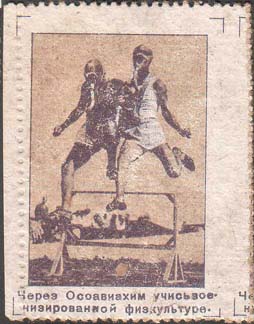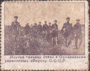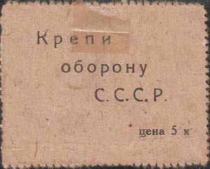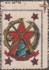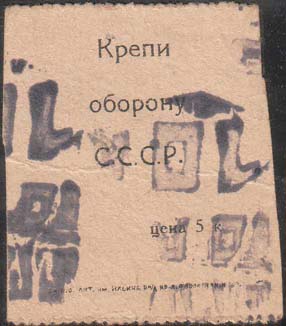 1932 1932(?) г. Первый выпуск. Одноцветная и двухцветная двухсторонняя печать на бумаге с мелованным верхним слоем. Нерегулярная зубц. и Б.З. На лицевой стороне в рамках различные рисунки. Внизу пояснительный текст. На оборотной стороне текст в четыре строки: «Крепи оборону СССР. Цена 5 к.». По углам разграничительные линии.