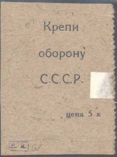 1931 1931 г. Разм. рамки 23 х 32,5 мм. Многоцветная печать на серо-зеленой бумаге с мелованным верхним слоем, тонированным в различные цвета. В двойной прямоугольной рамке в центре эмблема ОСОАВИАХИМ. По углам пятиконечные звезды. Внизу под рамкой слева выходные данные мелким шрифтом: «А 10. 25.-36.». На оборотной стороне оттиск штампа различных цветов разм. 24 х 7 мм. В штампе слева текст в две строки: «С[еверо].-К[авказский]. Крайсов[ет]. Осо-Авиахима». Справа в рамке номинал: «10 к.».