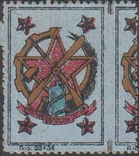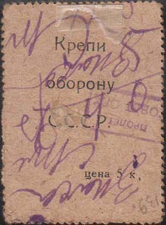 1932 1932(?) г. Третий вспомогательный выпуск. Серо-фиолетовая надпечатка на оборотной стороне текста в две строки: «Пролет[арский]. ОАХ».