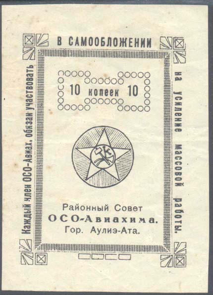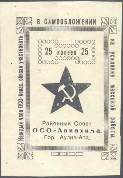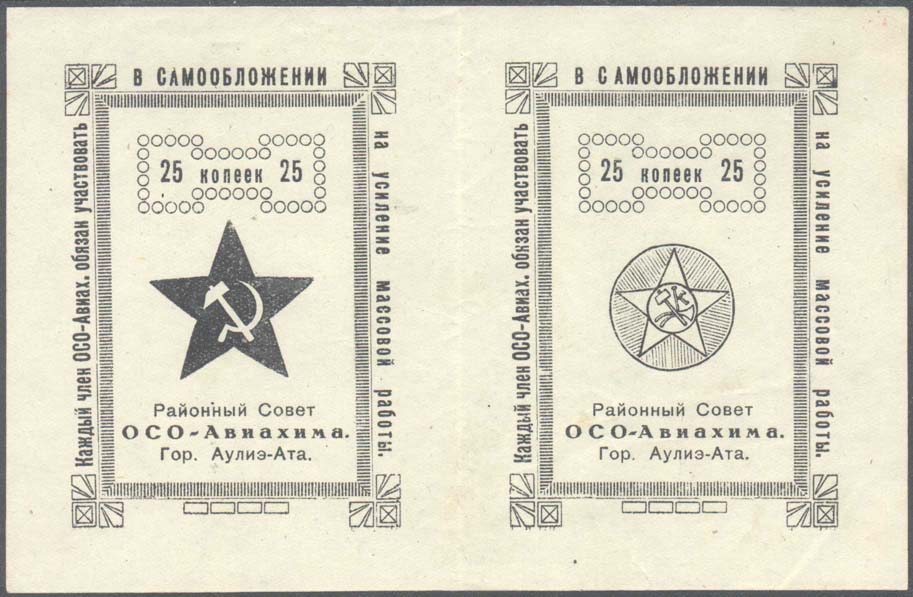 1931 1931 г. Второй выпуск. Разм. 75 х 100 мм. Одноцветная печать на плотной бумаге различных цветов. В центре в декоративной прямоугольной рамке различные рисунки. Сверху в декоративной рамке номинал. Внизу текст в три строки: «Районный Совет ОСО-Авиахима Гор. Аулиэ-Ата». По периметру рамки текст: «Каждый член ОСОАвиах[има]. Обязан участвовать в самообложении на усиление массовой работы».