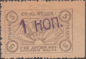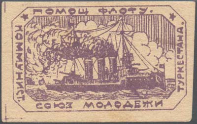 1930 1930(?) г. Разм. рамки 59,5 х 35,5 мм. Одноцветная печать на белой бумаге. В центре в двойной восьми-угольной рамке крейсер в море. По периметру рамки текст: «Коммунист[ический]. Союз Молодежи Туркестана. Помощь флоту».