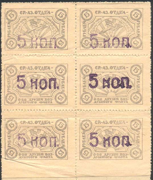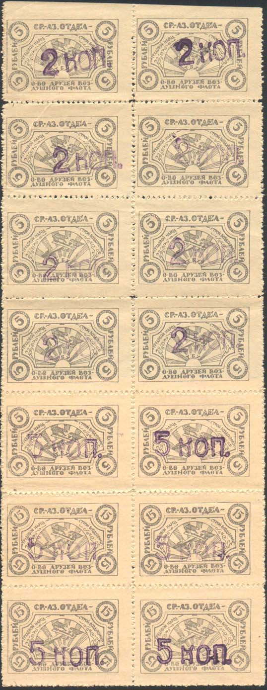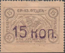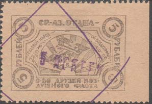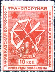 1931 1931 г. Одноцветная печать на белой бумаге. Нерегулярная зубц и Б.З. В двойной прямоугольной рамке разм. 28 х 37 мм в центре эмблема ОСО-АВИАХИМ, на фоне из наклонных линий. По углам пятиконечные звезды. Внизу под эмблемой номинал. По периметру между рамок текст: «Закавказская дорожно-транспортная организация ОСОАВИАХИМ. Крепи ряды ОСОАВИАХИМа».