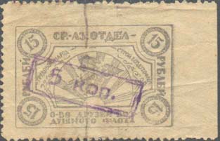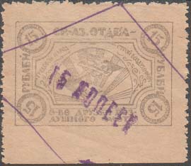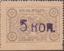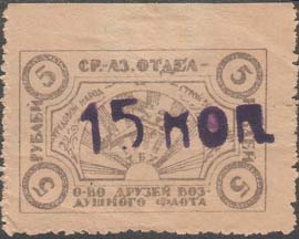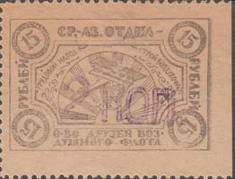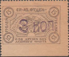 1924 1924 г. Третий вспомогательный республиканский выпуск. Фиолетовая надпечатка нового номинала ручным штампом на марках Средне-Азиатского отдела ОДВФ первого выпуска. Шрифт надпечатки мелкий.