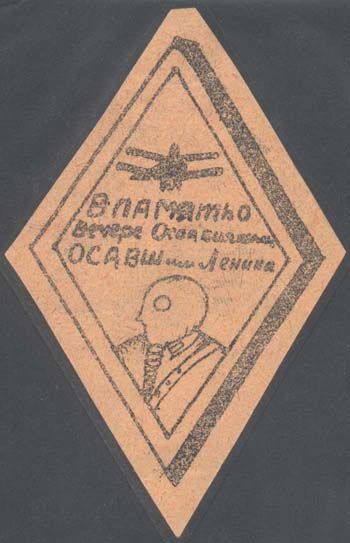1930 1930 г. Ромб разм. рамки 50 х 74 мм. Одноцветная печать низкого качества на бумаге различных цветов и качества. В двойной ромбовидной рамке в центре текст в три строки: «В память о вечере ОСОАВИАХИМ ОСАВШ им. Ленина». Сверху самолет, внизу изображение человека в противогазе.