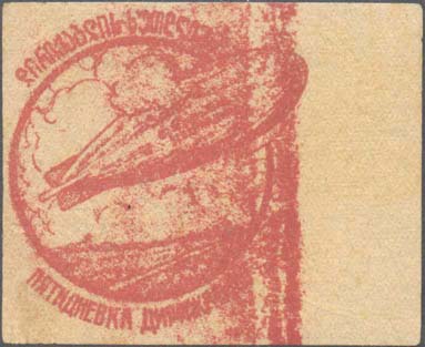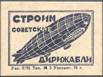 1931 1931 г. Разм. рамки 48 х 31 мм. Одноцветная печать на толстой коричневой бумаге. В рамке летящий вправо дирижабль и текст в три строки: «Строим советские дирижабли». Внизу под рамкой вы-ходные данные мелким шрифтом: «Узл. 5731 тип. №2. Узполигр. 31 г.».
