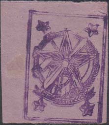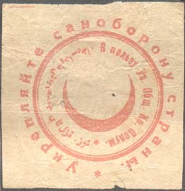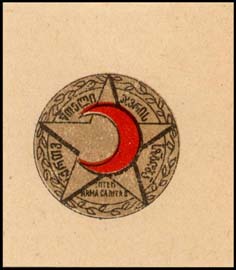 1932 1932 г. Разм. 40 х 40 мм. Двухцветная печать на сероватой бумаге. В центре в круге в обрамлении венка красный полумесяц на фоне пятиконечной звезды. По окружности текст на грузинском языке.