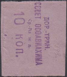 1930 1930 г. Разм. 36 х 42 мм. Одноцветная двухсторонняя печать на розово-синей бумаге. На лицевой стороне в прямоугольной рамке разм. 27 х 37 мм эмблема ОСОАВИАХИМ. На оборотной стороне вертикально тест в три строки: «Дор[ожно].-Тран[спортный]. Совет Осоавиахима Ср[едне].-Аз[иатской]. ж.д.». Ниже номинал.
