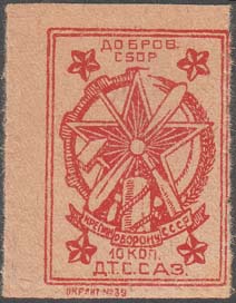 1931 1931 г. Разм. 37 х 48 мм. Одноцветная печать на плотной белой бумаге. Нерегулярная зубц. и Б.З. В двойной прямоугольной рамке в центре эмблема ОСОАВИАХИМ, по углам пятиконечные звезды. Сверху текст в одну строку: «Добров[ольный]. сбор». Внизу номинал: «10 коп.». Ниже аббревиатура «Д.Т.С.С.А.З.». Внизу под рамкой выходные данные: «Окрлит №39».
