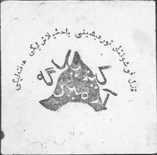 1923 1923 г. Октябрь. Разм. 85 х 84 мм. Одноцветная печать низкого качества на желтоватой бумаге. В центре буденовка и текст в две строки на узбекском языке арабским шрифтом. Сверху полукругом текст на узбекском языке арабским шрифтом.