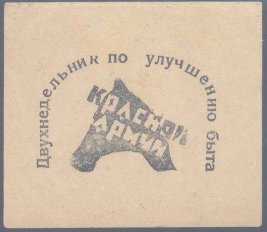 1923 1923 г. Октябрь. Разм. 88 х 76 мм. Одноцветная печать на желтоватой бумаге. В центре буденовка и текст в две строки: «Красной армии». Сверху полукругом текст: «Двухнедельник по улучшению быта».