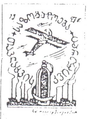1927 1927 г. Разм. ? х ? мм. Одноцветная печать на желтоватой(?) бумаге. В центре самолет-биплан, окруженный круговой рамкой из текста на грузинском языке. Внизу баллон с газом на фоне заводов. Внизу мелким шрифтом неразборчиво выходные данные.