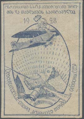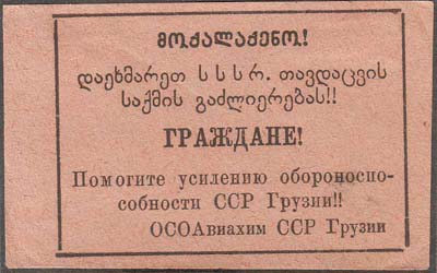 1930 1930 г. Разм. рамки 54 х 37 мм. Одноцветная печать на розово-серой бумаге. В центре текст в четыре строки: «Граждане! Помогите усилению обороноспособности ССР Грузии! ОСОАвиахим ССР Грузии». Сверху текст на грузинском языке в три строки.