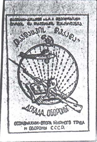 1928 1928 г. Разм. рамки 44 х 64 мм. Одноцветная печать на желтой бумаге. В центре в круглой рамке сверху в лучах солнца серп и молот, и летящий самолет. Внизу книга, винтовка и противогаз. Сверху текст в три строки на грузинском языке. Внизу текст в три строки: ««Декада обороны» Осоавиахим - опора мирного труда и обороны СССР».