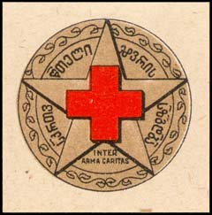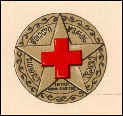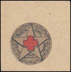 1932 1932 г. Разм. 40 х 40 мм. Двухцветная печать на сероватой бумаге. В центре в круге в обрамлении венка красный крест на фоне пятиконечной звезды. По окружности текст на грузинском языке.