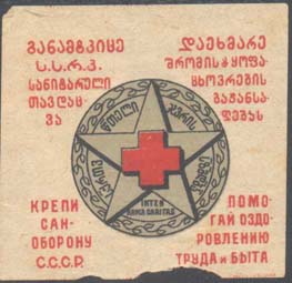1931 1931 г. 15.11.1931 г. Разм. 40 х 40 мм. Двухцветная печать на сероватой бумаге. В центре в круге в обрамлении венка красный крест на фоне пятиконечной звезды. По окружности текст на грузинском языке. Сверху текст на грузинском языке в пять строк. Внизу текст в четыре строки: «Крепи саноборону С.С.С.Р. Помогай оздоровлению труда и быта».