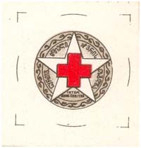 1932 1932 г. Разм. 40 х 40 мм. Двухцветная печать на сероватой бумаге. В центре в круге в обрамлении венка красный полумесяц на фоне пятиконечной звезды. Звезда не закрашена. По окружности текст на грузинском языке.