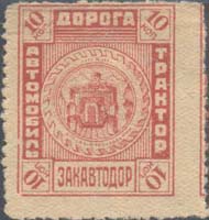 1932 1932 г. Разм. рамки 23,5 х 29 мм. Одноцветная печать на желтоватой бумаге. В центре в двойной прямоугольной рамке круглая рамка, стилизованной под автопокрышку. В круглой рамке автомобиль с шофером за рулем на фоне гор. По периметру прямоугольной рамки текст: «Автомобиль. Дорога. Трактор. Закавтодор». По углам рамки номинал.