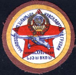 1932 1932(?) г. Составной знак. Круг диаметром 36 мм. Многоцветная печать на белой бумаге с подкладкой из красной материи. В круглой рамке на фоне красной звезды герб СССР и самолет. Текст на русском и грузинском языках: «Красн[ый]. Партизан Грузии XVI съезду В.К.П.(б)».