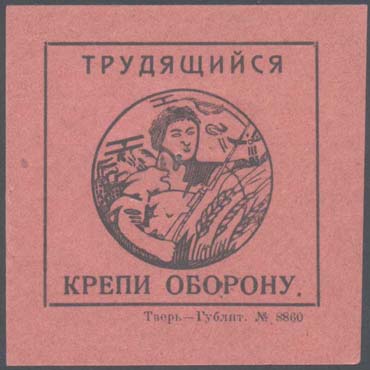 1927 1927 г. Разм. рамки 46 х 44 мм. Одноцветная печать на розовой бумаге. В центре в круглой рамке рабочий с винтовкой на фоне аграрно-индустриального пейзажа. Сверху самолеты в облаках. Текст в две строки: «Трудящийся крепи оборону». Справа внизу под рамкой мелким шрифтом выходные данные: «Тверь Гублит №8860».