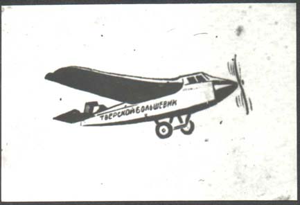 1931 1931 г. 01.11.1931 г. Разм. 72 х 48 мм. Одноцветная печать на белой бумаге. Самолет «Тверской большевик», летящий вправо.