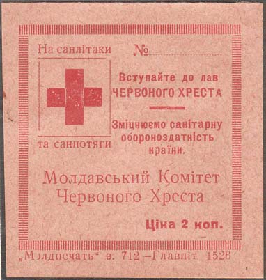 1932 1932 г. Разм. рамки 49 х 49 мм. Одноцветная печать на толстой белой бумаге со сплошным фоном на лицевой стороне. В левом верхнем углу красный крест в прямоугольной рамке. Сверху над рамкой текст на украинском языке: ««На сансамолеты». Внизу под рамкой продолжение текста на украинском языке: «И санпоезда». В правом верхнем углу текст в три строки на украинском языке: «№... Вступайте в общество Красного Креста». В центре справа текст в три строки на украинском языке: «Укрепим санитарную обороноспособность страны». Ниже в центре текст в две строки на украинском языке: «Молдавский Комитет Красного Креста». В правом нижнем углу номинал на украинском языке: «Цена ... коп.». Внизу под рамкой выходные данные мелким шрифтом на украинском языке: ««Молдавпечать» з.712 – Главлит 1526».