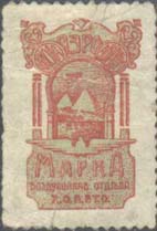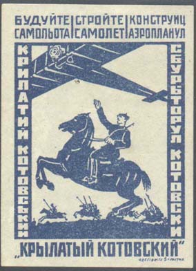 1927 1927(?) г. Разм. рис. 41 х 47 мм. Одноцветная печать на белой бумаге. Нерегулярная зубц. и Б.З. В центре всадники и летящий над ними самолет-биплан. Текст на русском, украинском и молдавском языках: «Строим самолет «Крылатый Котовский»». Внизу мелким шрифтом выходные данные: «Одесса, 3-я гостип».