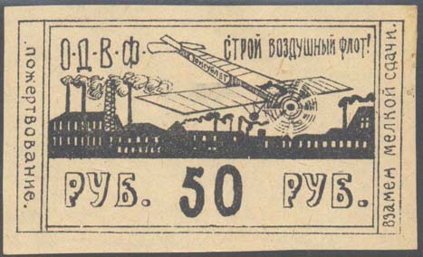 1923 1923 г. Разм. рамки 71 х 39 мм. Одноцветная печать на серовато-желтой бумаге. В двойной прямоугольной рамке самолет-моноплан «Томгублет» над заводскими зданиями. Сверху текст: «О.Д.В.Ф. Строй Воздушный Флот!». Внизу номинал. Справа и слева между линиями рамки вертикально текст: «Пожертвование. Взамен мелкой сдачи».