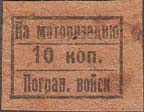 1931 1931 г. Разм. рамки 18,5 х 14 мм. Одноцветная печать на светло-коричневой бумаге. В прямоугольной рамке центре номинал. Сверху текст: «На моторизацию». Внизу продолжение текста: «Погран[ичных]. войск»