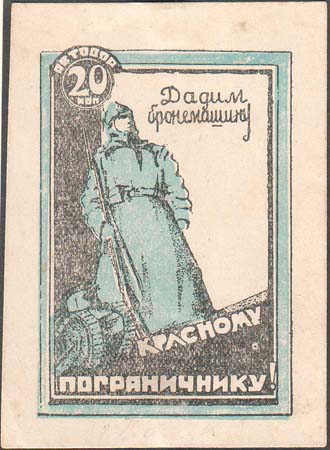 1932 1932(?) г. Разм. рамки 42,5 х 61,5 мм. Двухцветная печать на толстой белой бумаге. В двойной прямоугольной рамке красноармеец с винтовкой и танк. В левом верхнем углу в двойной круглой рамке номинал и текст: «Автодор». В правом верхнем углу текст в две строки: «Дадим бронемашину». Внизу продолжение текста в две строки: «Красному пограничнику!».