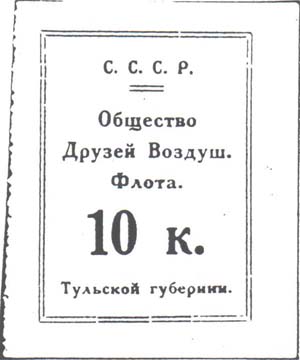 1925 1925 г. Областной выпуск. Листок из квитанционной книжки разм. рамки 36 х 49 мм. Двухцветная печать на белой бумаге. Нерегулярная левосторонняя зубц. В двойной прямоугольной рамке в центре текст в три строки: «Общество друзей Воздуш[ного]. Флота». Сверху аббревиатура «С.С.С.Р.» и два горизон-тальных штриха. Внизу номинал и продолжение текста: «Тульской губернии».