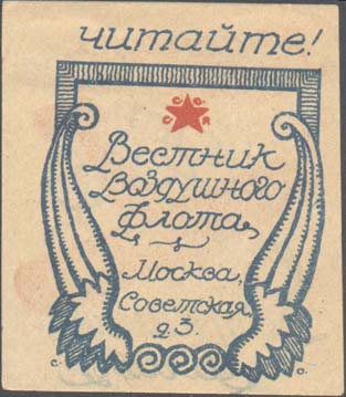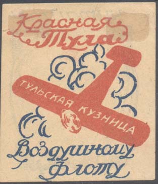 1926 1926(?) г. Разм. 51 х 60 мм. Двухцветная двухсторонняя печать на кремовой бумаге. На лицевой стороне самолет «Тульская кузница», летящий в облаках влево вниз. Текст в четыре строки: «Красная Тула Воздушному Флоту». На оборотной стороне в декоративной рамке пятиконечная звезда с аббревиатурой С.С.С.Р. и текст в семь строк: «Читайте! Вестник воздушного флота. Москва, Советская, д.3.».